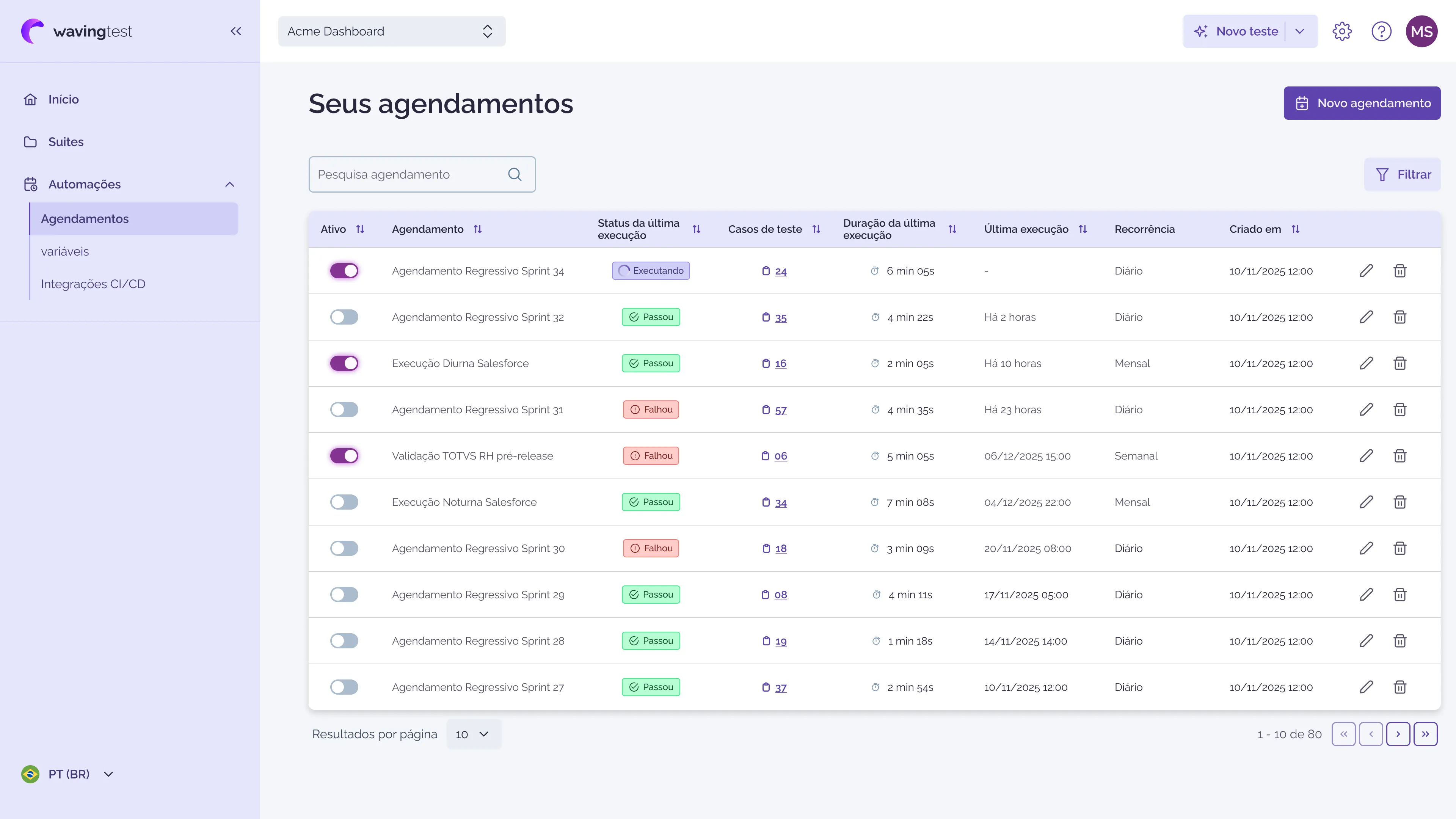 A grande dor da nossa equipe era a falta de controle e a baixa eficiência, que gerava atrasos enormes. O tempo que perdíamos consertando teste quebrado ou esperando programador era surreal. O time de QA vivia apagando incêndio, e nós, da liderança, ficávamos sem dados de performance e métricas confiáveis. A Wavingtest chegou pra botar ordem na casa. O fato de ser codeless e de a gente conseguir padronizar o processo de qualidade de software em um só lugar foi essencial.