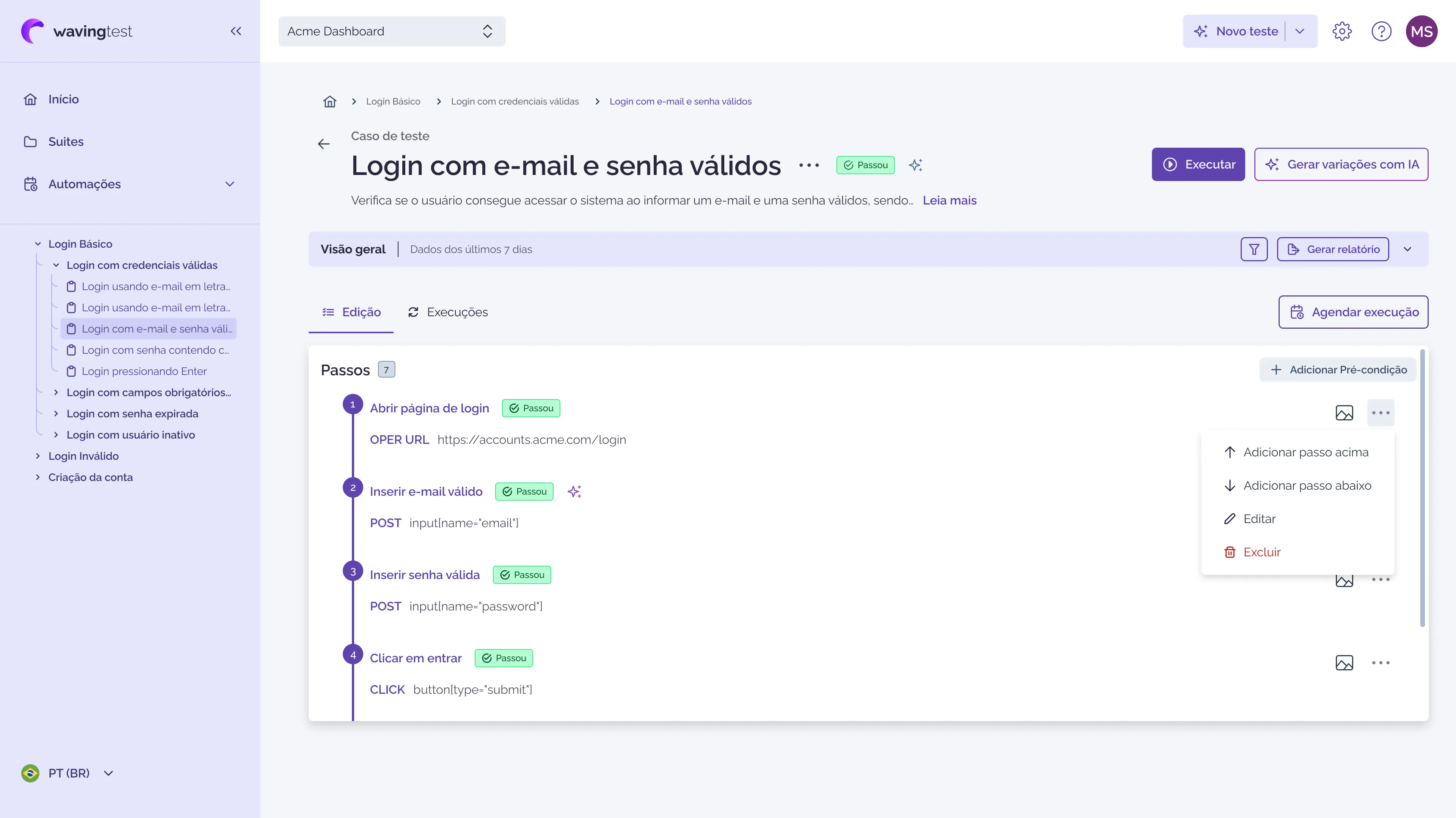 Redução de 70% no esforço para criação e manutenção de casos de testes. Nosso Agente de IA altera os casos de testes automaticamente.